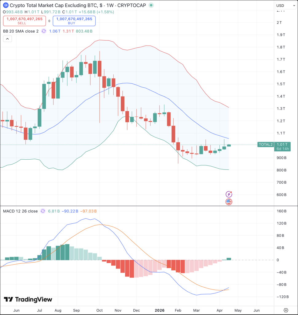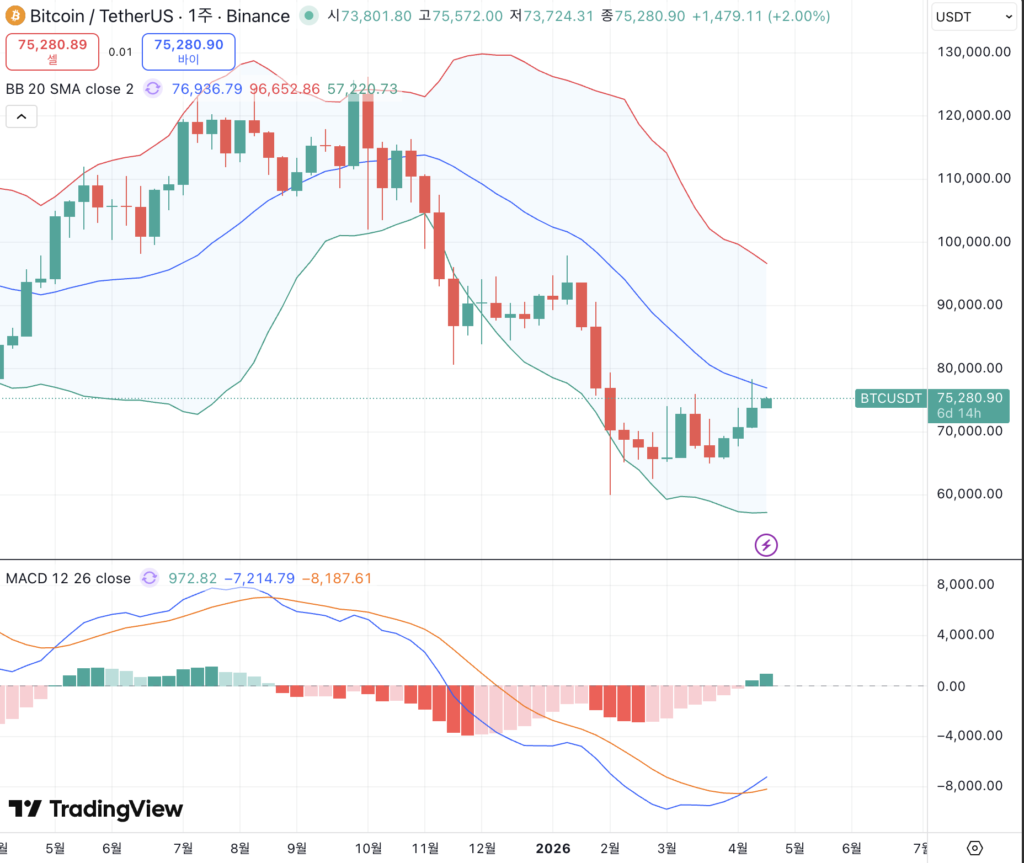 이번 주 가장 결정적인 장면은 비트코인 주봉 차트에서 나왔다. MACD 지표가 드디어 골든크로스를 기록했다. 2024년 8월 하락 추세가 시작된 이후 약 20개월 만의 신호다. 물론 골든크로스가 발생했다고 해서 바로 수직 상승을 의미하는 것은 아니다. 추세가 완전히 확장되기까지는 시간이 더 필요하지만, 최소한 하락의 관성이 상승의 관성으로 바뀌었다는 점은 부정할 수 없는 사실이다.
