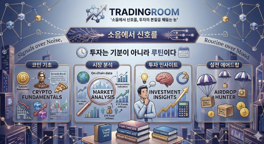 트레이딩룸(TradingRoom)은 단순히 가격의 오르내림을 쫓는 곳이 아닙니다. 블록체인 기술의 근본적인 원리부터 시장의 역사, 그리고 실전 트레이딩을 위한 기초 체력까지 아우르는 프리미엄 가상자산 교육 및 분석 플랫폼입니다. 우리는 넘쳐나는 정보의 홍수 속에서 투자자가 생존을 넘어 수익을 거둘 수 있는 진실된 신호(Signal)를 전달합니다.
