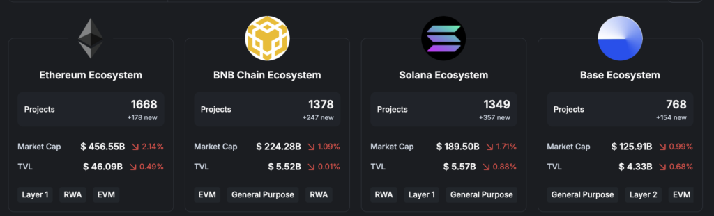 플랫폼 시장을 분석할 때 가장 먼저 살펴봐야 할 것은 기술적 독립성이다. 현재 블록체인 인프라 시장은 크게 이더리움(ETH) 중심의 EVM 호환 생태계와 솔라나 중심의 비EVM(Non-EVM) 생태계로 양분되어 있다.