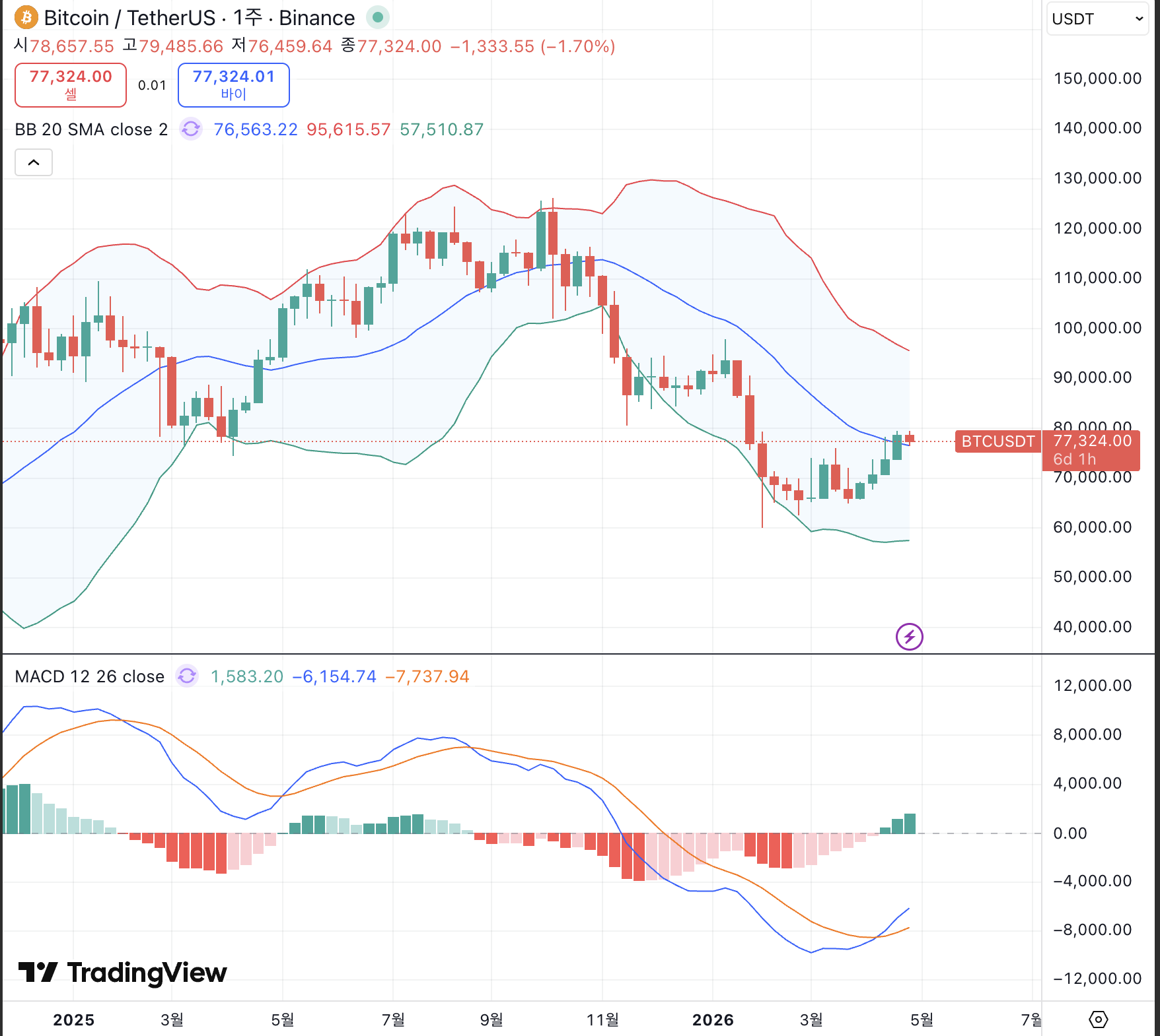 지난주 리포트에서 언급했던 비트코인 주봉 MACD 골든크로스가 드디어 확정 단계에 접어들었다. 단순히 선이 겹친 수준이 아니라, MACD 히스토그램이 2주 연속 양의 영역에서 증가하며 추세 전환의 강도를 높이고 있다. 주봉 단위의 시그널은 단기적인 변동성에 흔들리지 않는 묵직한 신뢰를 준다.